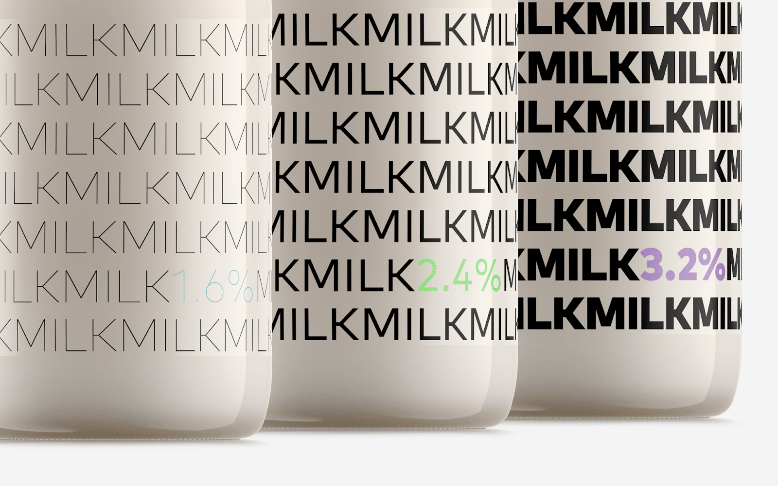 阿塞拜疆設計師Rahim Ismayil設計的牛奶包裝,設計師通過字體粗細來表現牛奶的脂肪含量。粗體字表示脂肪含量高,而細體字則表示脂肪含量低。通過瓶蓋顏色和極簡外觀讓人有一種新鮮直觀的感覺。讓人在遠處看到,想走近拿起來,進一步了解情況的沖動。