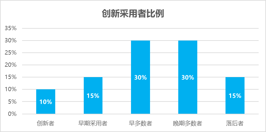 品類創新并不意味著就能獲得市場的認可,因為消費者的認知并不是純粹理性,而是受到個人認知、需求、個性、經濟、社交、文化等各個層面的影響,不同的消費者接受創新產品所需的時間和條件是不同的,基于該特點,社會學家提出了著名的“創新采用者理論”,即消費者可劃分為五個類型——創新者、早期采用者、早期多數者、晚期多數者和落后者。五大類別消費者的平均占比服從統計學上的正態分布:創新者10%、早期采用者15%、早多數者30%、晚期多數者30%、落后者15%。